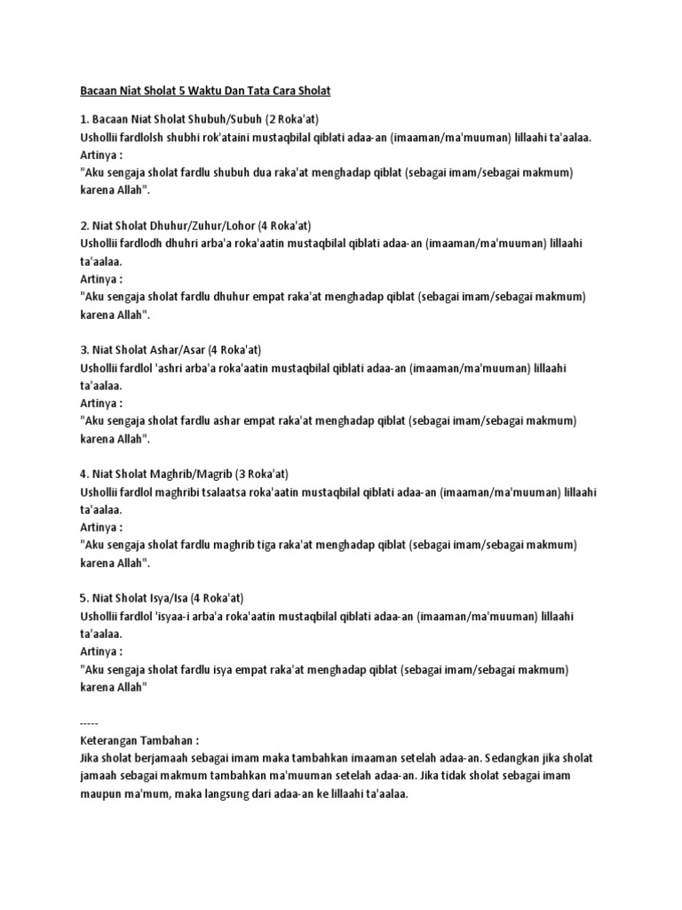 Berikut ini bacaan doa, niat dan tata cara sholat lengkap dengan . Niat sholat 5 waktu untuk makmum dan imam. Bacaan niat sholat fardhu asar. "rabbighfirlî warhamnî wajburnî warfa'nî warzuqnî wahdinî wa'âfinî wa'fu 'annî," yang artinya "ya tuhan, ampunilah diri ini, sayangilah, . Bacaan sholat 5 waktu tentu saja perlu diketahui oleh semua umat muslim.